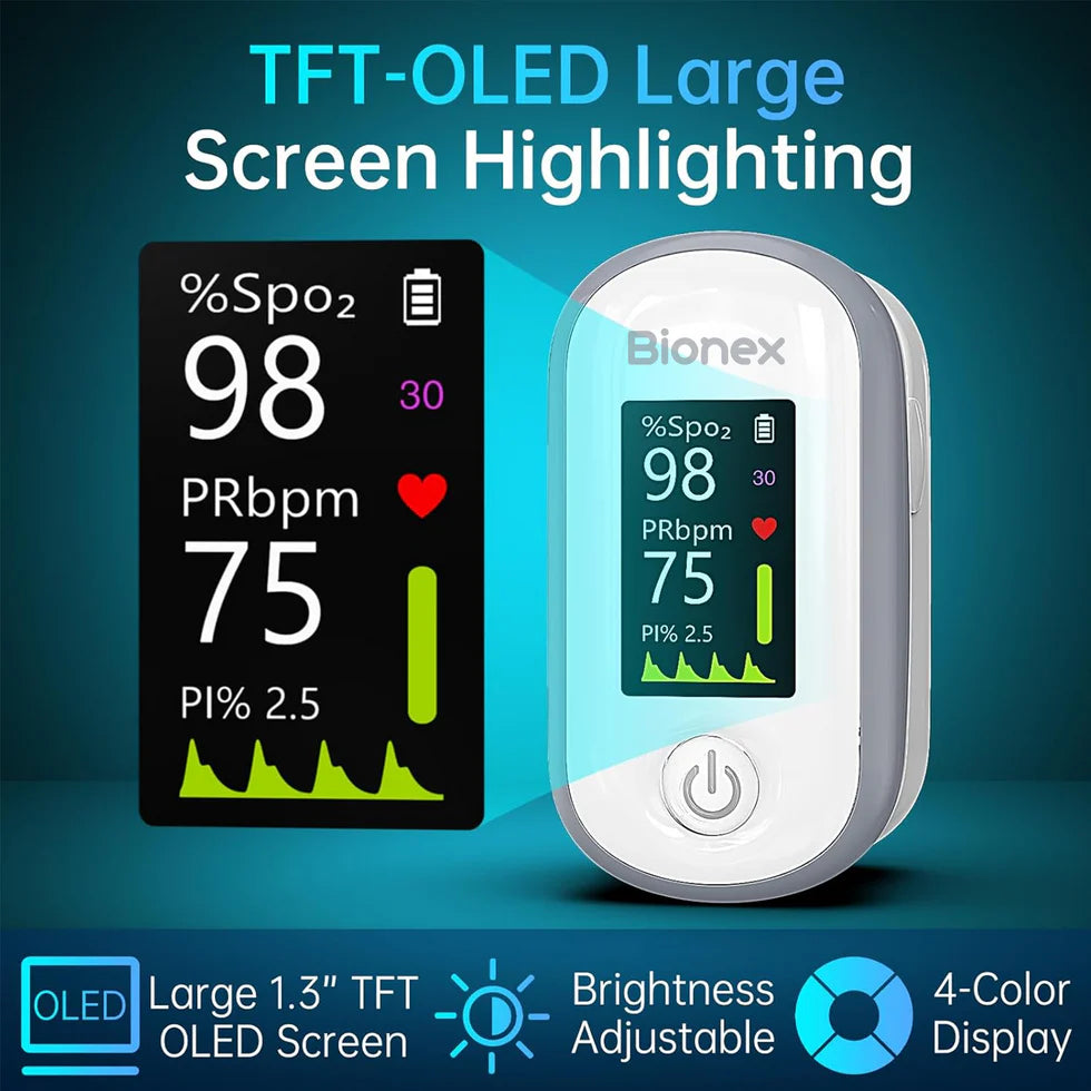 Featuring a 1.3" TFT-OLED display, the Bionex oximeter offers high-contrast visibility, adjustable to five brightness levels (default at maximum), making it easy for seniors and anyone needing a clear display.