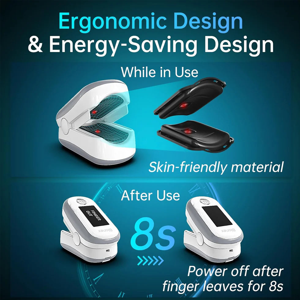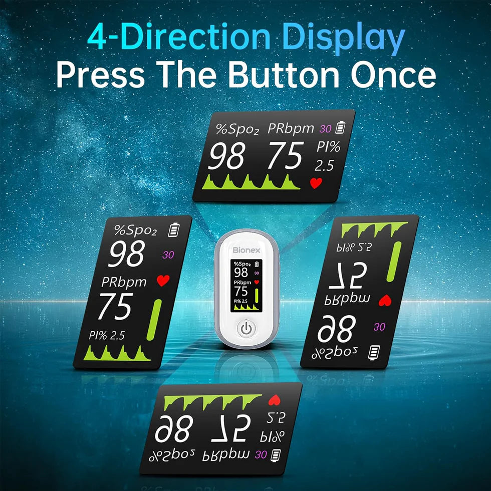 Equipped with advanced sensors, the Bionex fingertip pulse oximeter provides quick, precise results. Its dual light-blocking shield design minimizes interference from external light, ensuring accuracy with each reading.